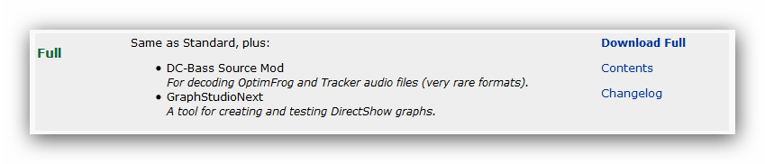 Full – всё, что входит в предыдущие варианты плюс несколько кодеков для редких форматов и приложение GraphStudioNext;