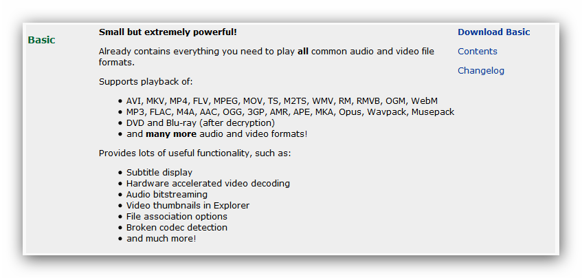 Прежде чем приступать к установке, пользователю нужно решить, для каких именно целей ему нужны кодеки. В ином случае он рискует засорить свою ОС ненужными компонентами, которыми он пользоваться не будет. В большинстве случаев достаточным является набор «Basic», которому без труда можно назначить любой плеер по умолчанию. В описании набора пишется, что воспроизводится будут все аудио и видео файлы с обычными расширениями, такими, как: AVI, MKV, MP4, MP3, FLAC, DVD, Blu-ray и так далее.