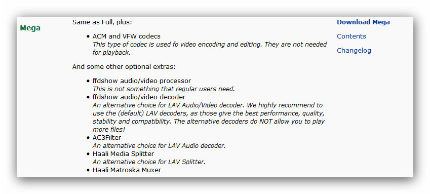 Mega – все доступные кодеки и утилиты от разработчиков пакета, в том числе и необходимые для редактирования аудио- и видеофайлов.