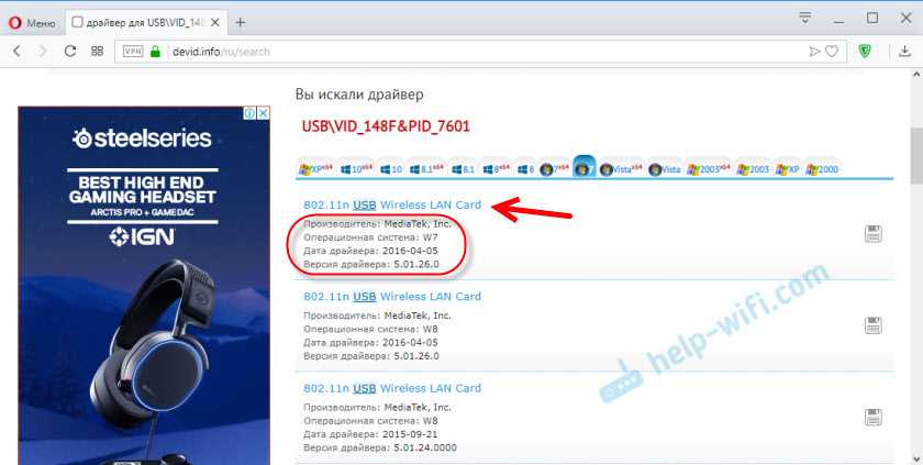 Просто вставляем ИД в Google, или Яндекс и смотрим найденную информацию. Сразу в результатах поиска я уже вижу, что мой адаптер построен на чипе MT7601U от Ralink. Мы знаем производителя, и можем вернутся к загрузке драйвера с официального сайта (ноутбука/адаптера). Или искать драйвер для чипсета Ralink MT7601U (по модели).