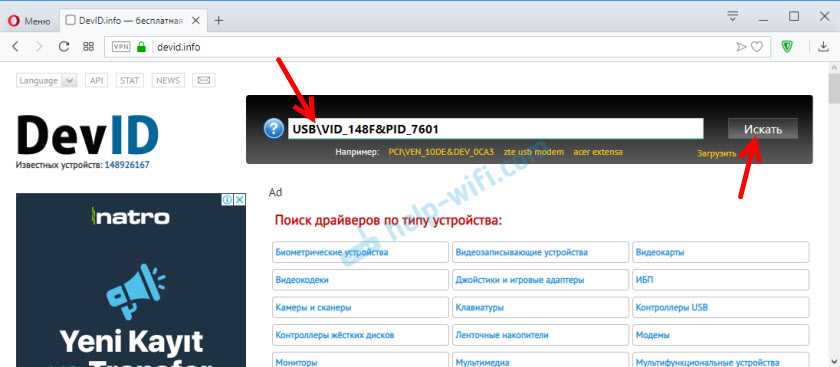 Заходим на сайт devid.info и в строку поиска вставляем код «ИД оборудования». Не забывайте, что лишнее в коде нужно удалить. Отставить только значение VID и PID. В противном случае поиск может не дать результатов.