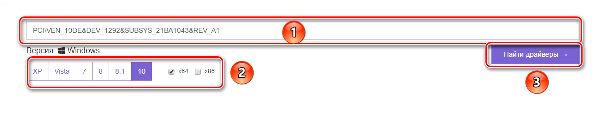 - В поле поиска, которое расположено вверху сайта, вводим скопированное значение ID устройства. Чуть ниже выбираем необходимую операционную систему и разрядность. После этого нажимаем кнопку «Enter» на клавиатуре, либо кнопку «Найти драйверы» на сайте.