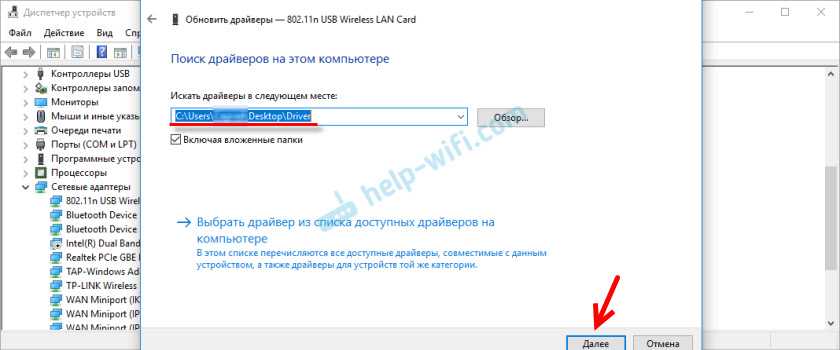 Дальше пункт «Выполнить поиск драйверов на этом компьютере» и указываем путь к папке с драйвером.