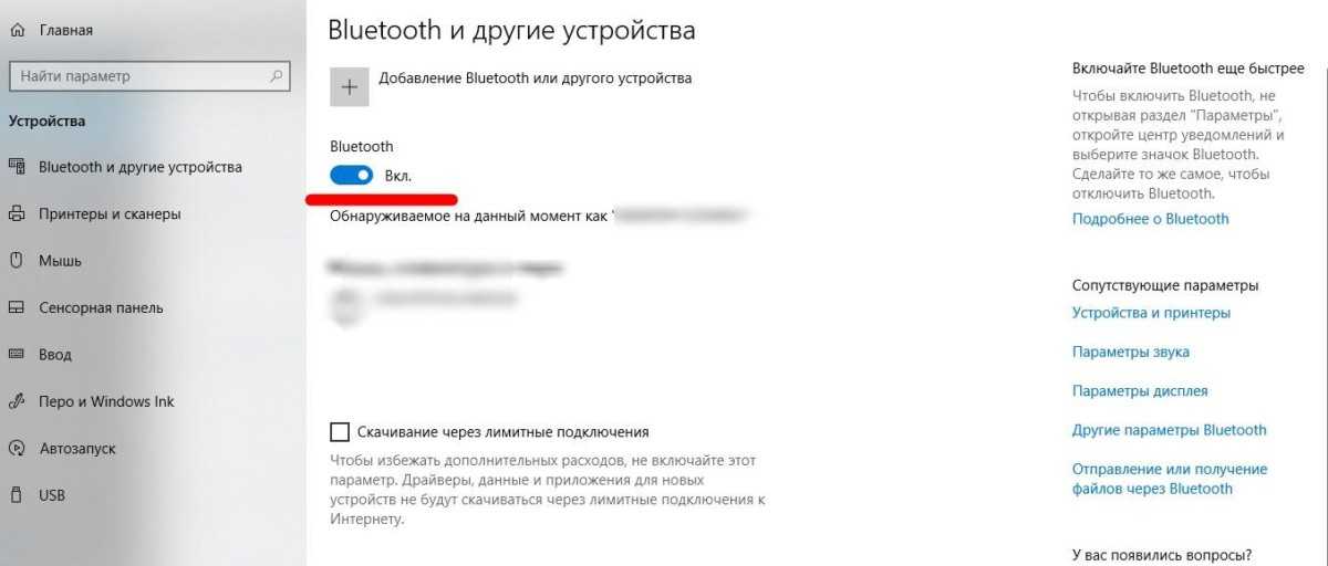 Одним кликом мышки перевести выключатель в положение «ВКЛ». Если у вас возникнет вопрос, как отключить Блютуз на ноутбуке Виндовс 10, вам достаточно будет снова вернуться в этот раздел и нажать на переключатель еще раз.