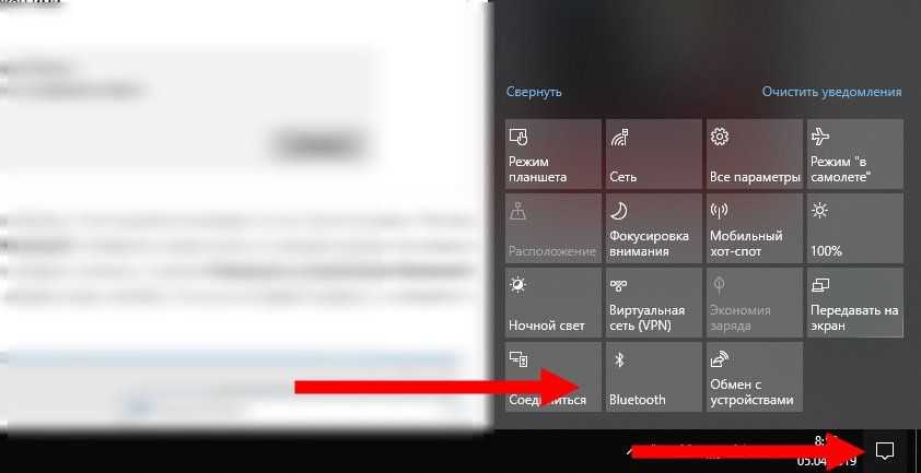 На самом деле все предельно просто. Найдите значок центра уведомлений. Нажмите на него и увидите среди «квадратиков» Bluetooth. Если блок синего цвета, это значит, что технология активна, чтобы ее выключить нажмите на кнопку.