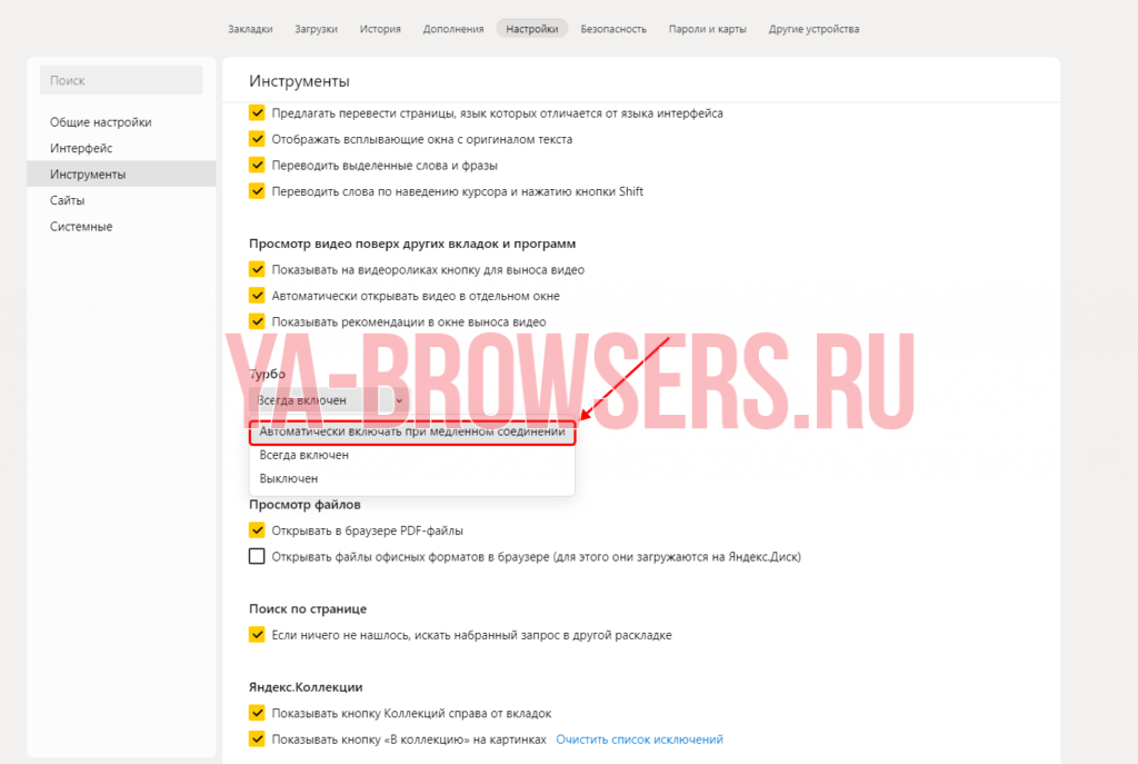 - В отобразившейся вкладке пролистываем немного вниз и находим блок «Турбо». В нем выбираем «Всегда включен».