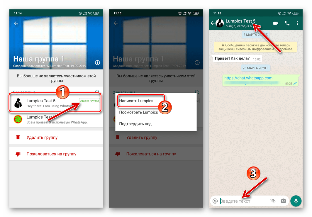 В случае когда вы только вышли из группы ВатсАп, но не удалили ее из перечня доступных в разделе «Чаты» мессенджера, написать модератору не составит труда, даже если его контакт вы не сохраняли в свою адресную книгу: