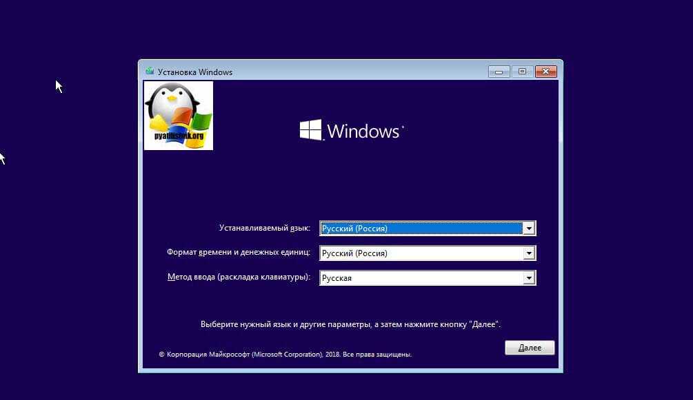 У вас начнется загрузка с установочного диска. В мастере установки оставьте язык по умолчанию и нажмите далее.