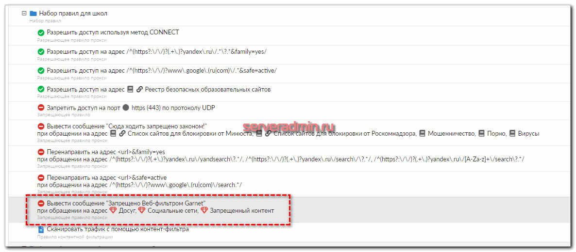 Попробуем создать собственное запрещающее правило на основе категорий трафика Garnet. Например, запретим следующие категории: