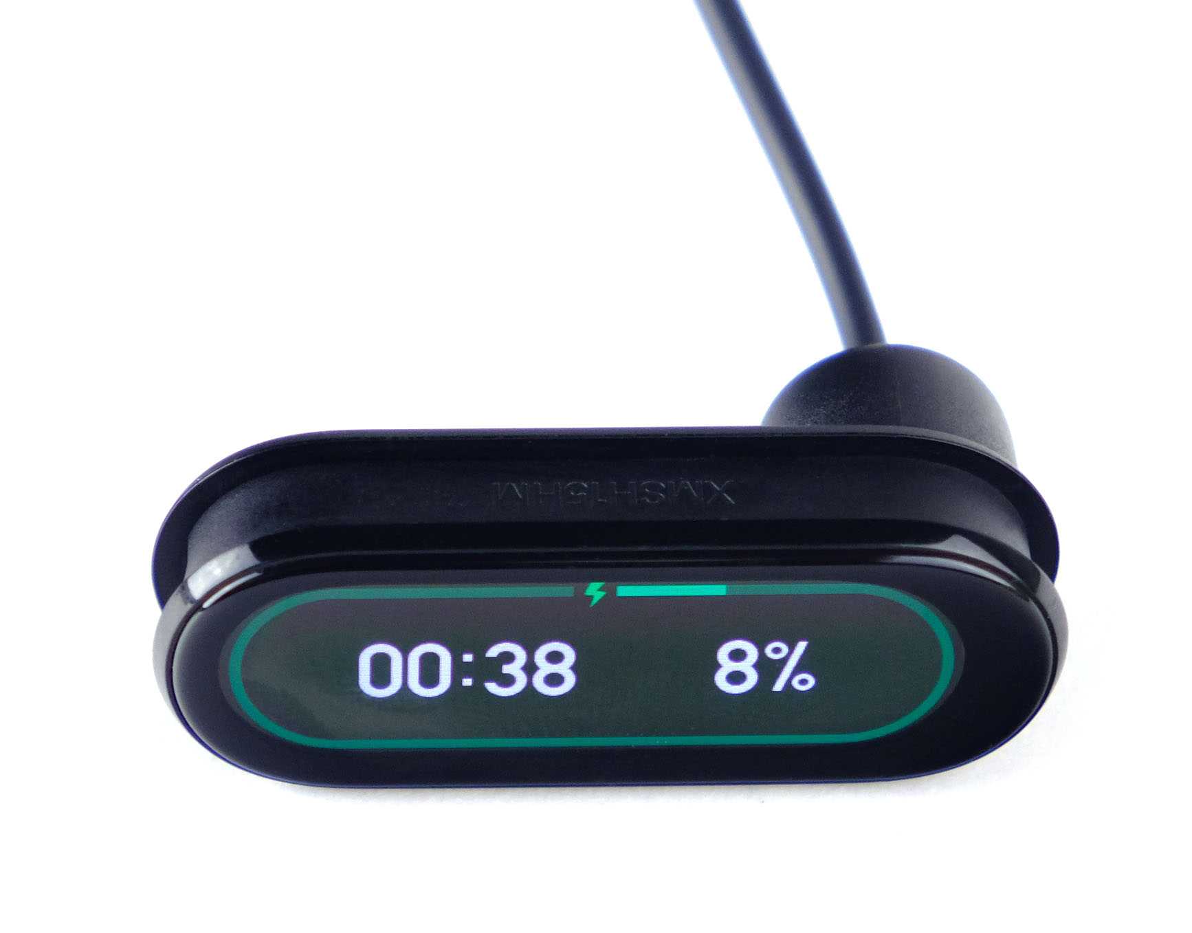 При разрядке Mi Band 6 подаёт сигнал вибрацией и сообщениями на дисплее. Происходит это при уровне заряда 5-10%. Ёмкость батареи у модели – 250 мАч, и зарядка от USB порта ПК происходит примерно за 2 часа (до 50% за 30 минут). При этом на экране отображается текущий прогресс.