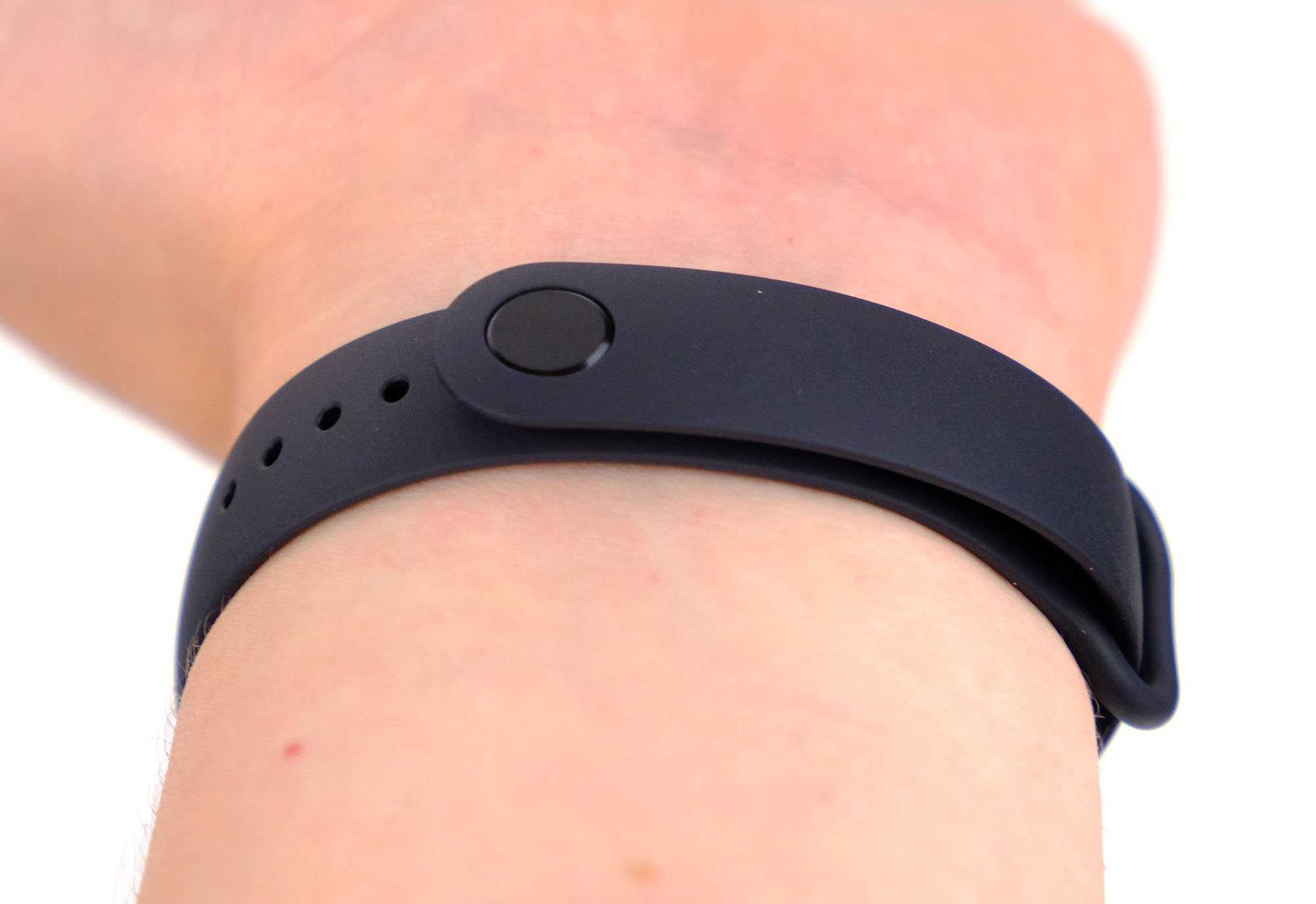 Поменялась и кнопка сенсорного типа. Если до этого она обладала компактным углублением для пальца, то сейчас выполнена на одном уровне с дисплеем, упор на нее сделан с помощью значка. Устройство комфортно ощущается на руке, вплотную примыкая к ней. На запястье девайс выглядит весьма модно — нет чувства присутствия дешевого гаджета из Китая. Базовый ремень прочно крепится на запястье кольцом в пределах 14-20,5 мм. Дисплей отличается яркостью и интенсивностью. Если сравнивать с прошлой версией, то оповещения на дисплее устройства стали значительно четче и читабельнее.