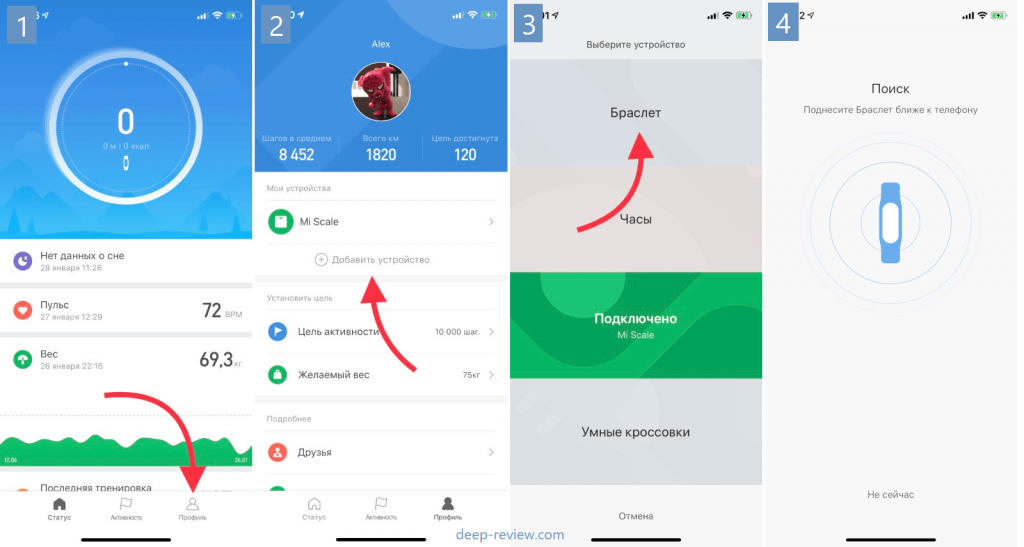 Сопряжение происходит довольно быстро, требуется только завести учетную запись, если еще этого не сделали, и по желанию ввести свои исходные данные (вес, рост). Либо же добавить новое устройство, если у вас уже была одна из предыдущих моделей фитнес-браслета Xiaomi.