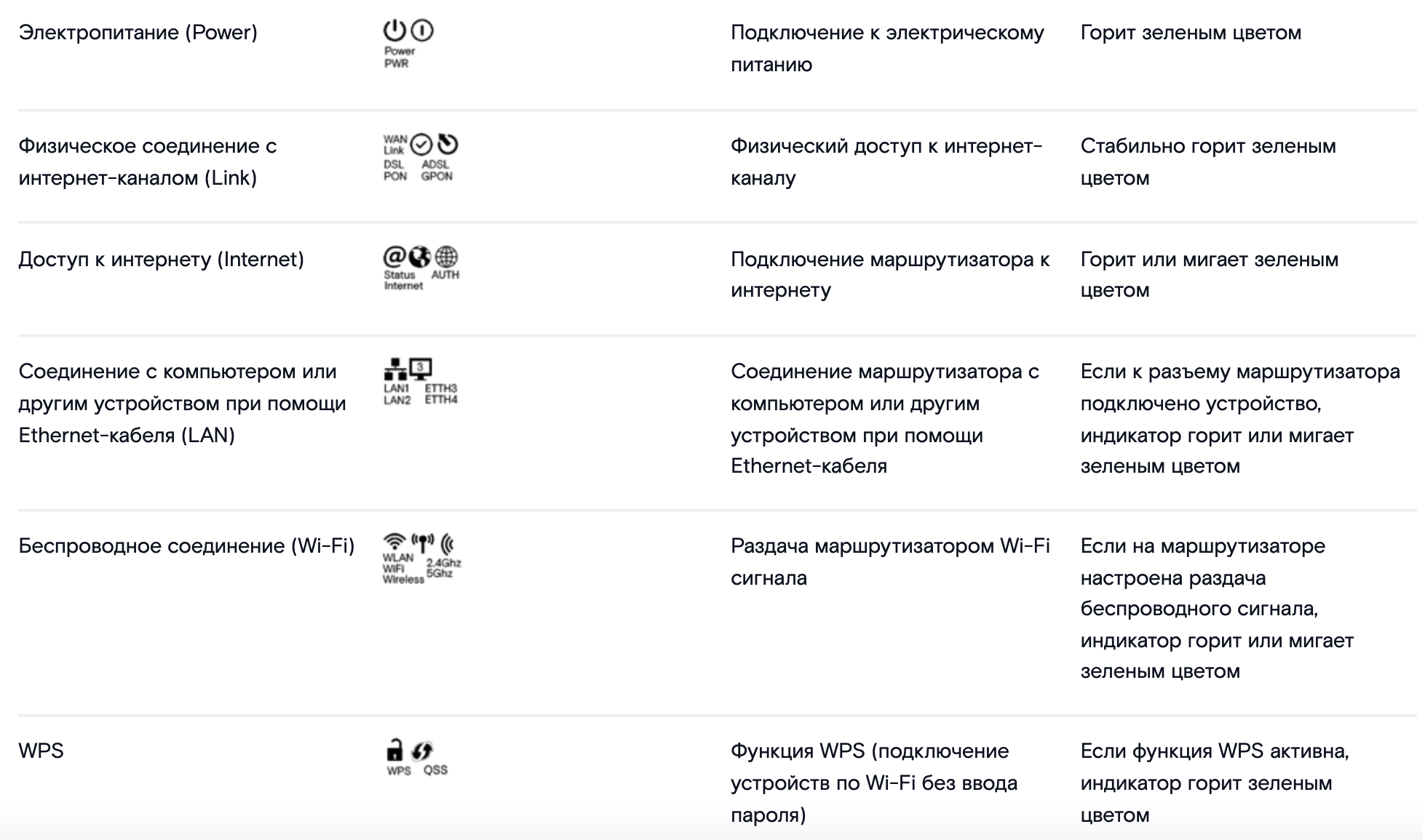 Для определения причины отсутствия подключения можно использовать индикаторы на роутере. Ниже представлена таблица с подробным описанием всех лампочек на маршрутизаторах Ростелекома.