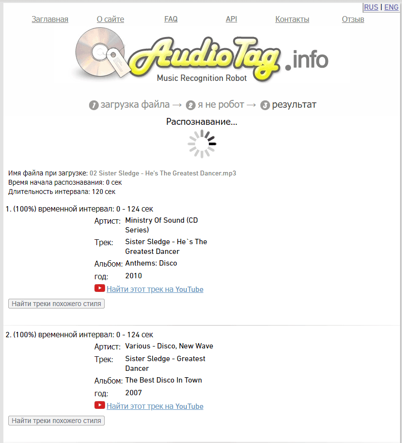 Кстати, если песня популярна, то будут указаны проценты сходства с вашим файлом.