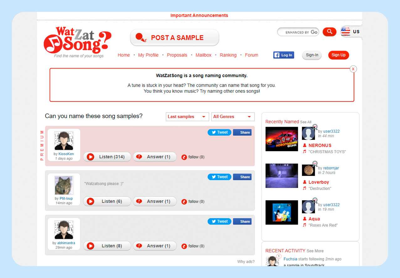 - Популярный американский сайт namemytune, завлекает простотой и отзывчивой аудиторией. При оформлении заявки пишите всё что знаете про трек, когда его было слышно, текст приблизительный, можете даже напеть (если медведь не наступил). При любом ответе приходит письмо на электронную почту, советую gmail, остальные подозрительно относятся к таким вещам.