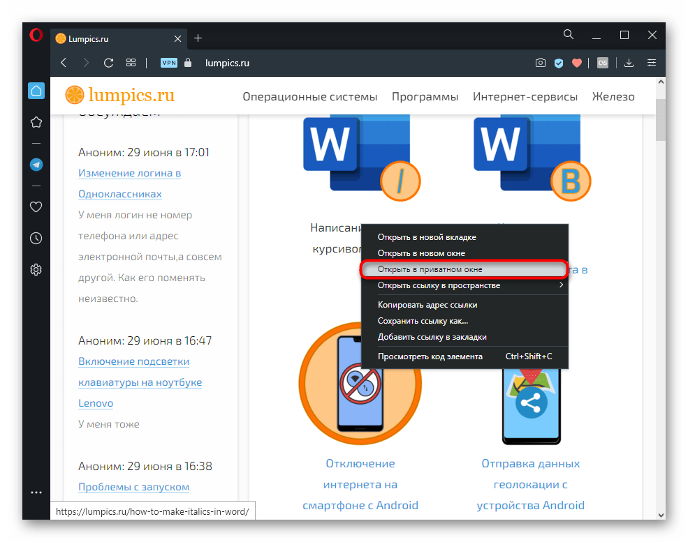Когда необходимо открыть в инкогнито какую-то ссылку на странице, достаточно просто кликнуть по ней правой кнопкой мыши и выбрать пункт «Открыть в приватном окне». Анонимное окно запустится сразу же с этой ссылкой.