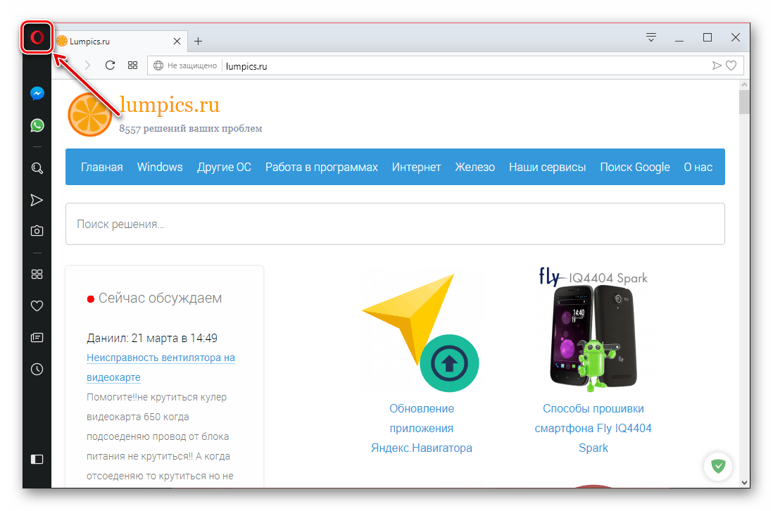 Итак, открываем браузер. Далее в левом верхнем меню нажимаем кнопку значка «Opera».