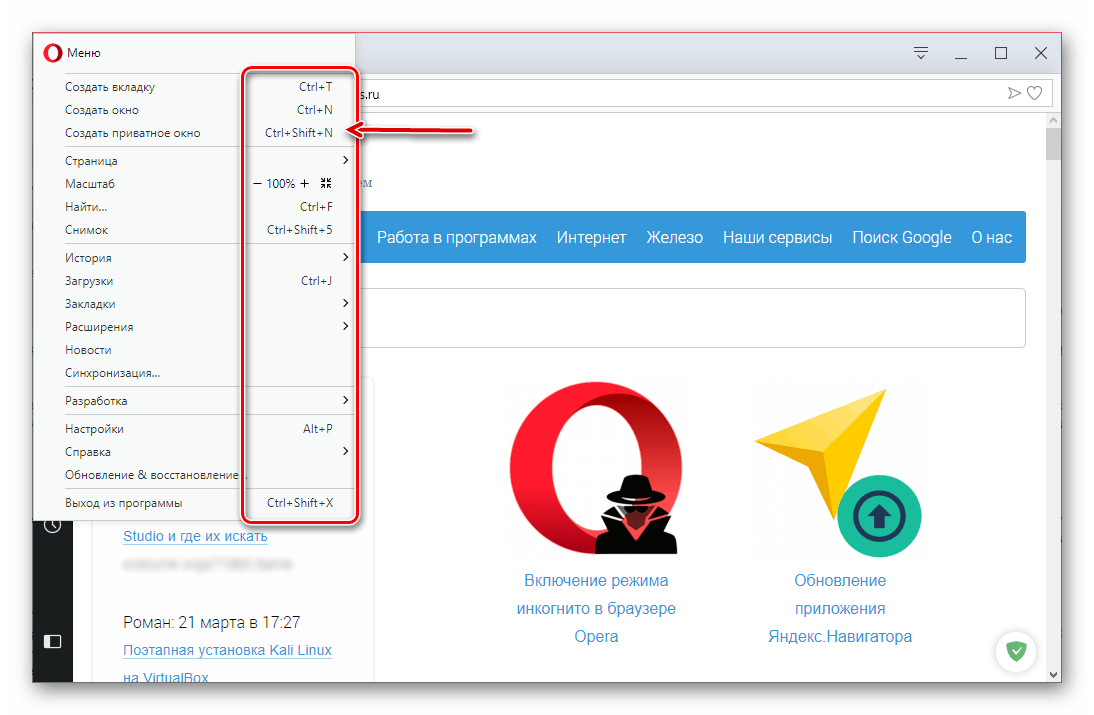 Как вы наверняка заметили, в основном меню Opera напротив некоторых пунктов указаны комбинации клавиш, посредством которых можно быстро выполнить то или иное действие.  Так, для того чтобы «Создать приватное окно», просто нажмите на клавиатуре «CTRL+SHIFT+N».
