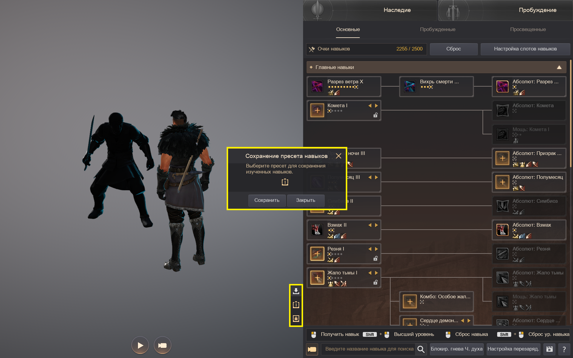 Функцию сохранения пресета навыков можно использовать когда угодно и где угодно, однако для того, чтобы применить сохраненный пресет навыков, нужно использовать Свиток Убывающей луны либо обратиться к Тренеру.