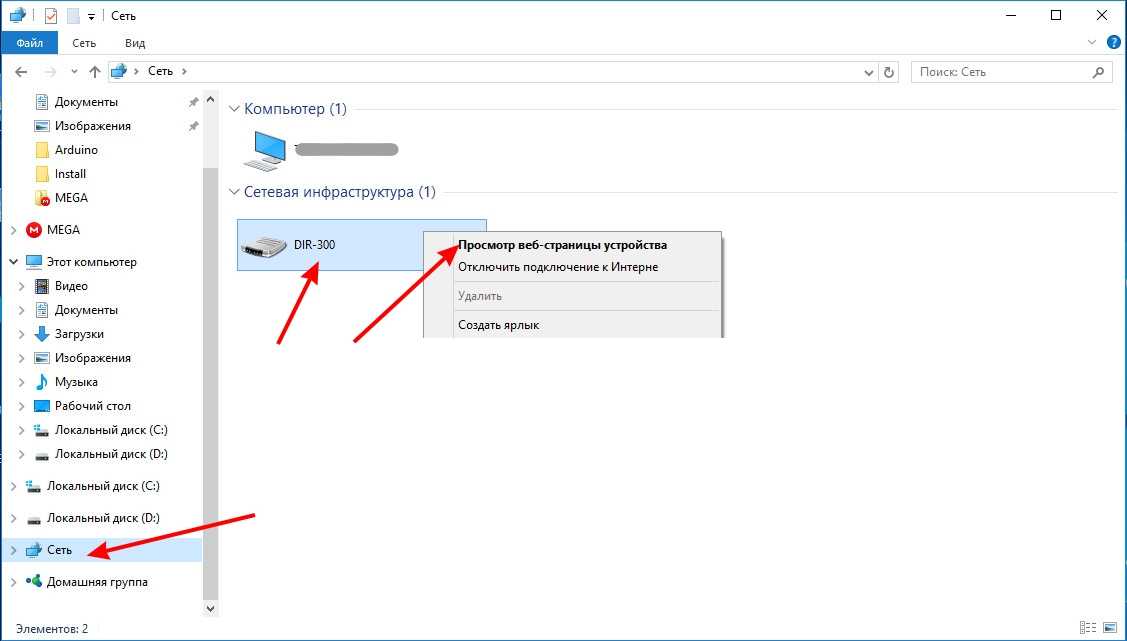 Для пользователей системы Windows существует ещё один простой и удобный способ. Открываем значок Мой компьютер(Этот компьютер), переходим в Сеть. И там можно увидеть наш маршрутизатор. Нажав на нем правой кнопкой мыши, открывается небольшое контекстное окно. Нажимаем в нем пункт Просмотр веб-страницы устройства. В результате откроется браузер со страницей авторизации нашего роутера и вам не нужно вводить адрес вручную.