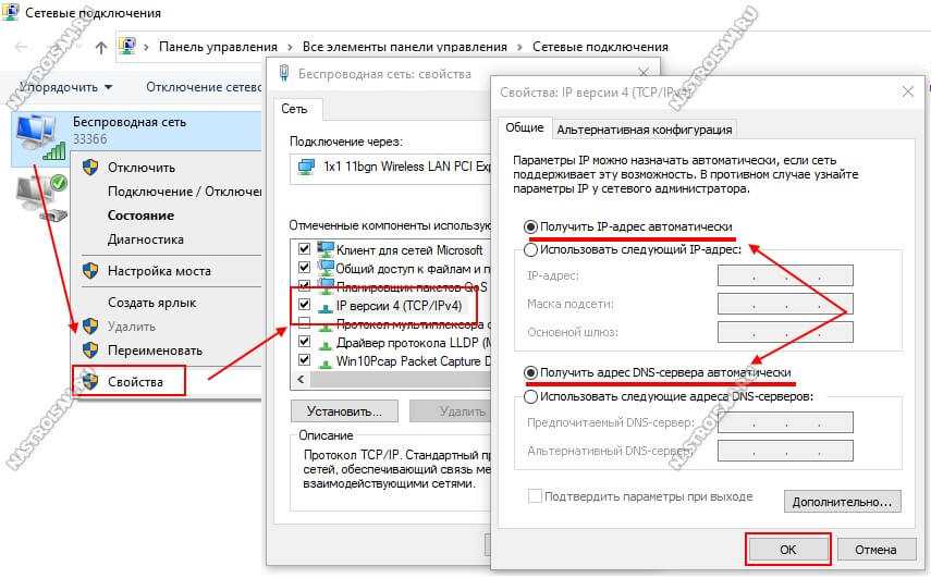 Дальше надо будет найти компонент «IP версии 4(TCP/IPv4)» и открыть его свойства. В следующем окне проверьте, чтобы стояло автоматическое получение и IP адреса и DNS-серверов. Обычно, если прописан провайдерский или публичный DNS-сервер, то через tplinkwifi.net войти в настройки роутера не получится, так как этот сервер будет перенаправлять запросы сразу в Интернет.