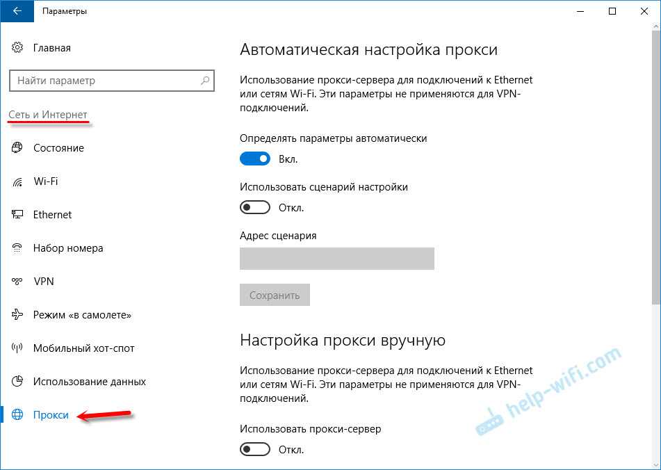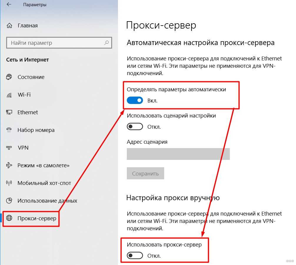 2 Чтобы проверить, нет ли ненужных настроек в свойствах прокси-сервера, нужно снова же зайти в параметры, в раздел “Сеть и Интернет” на вкладку “Прокси”. Проверьте, чтобы там все было отключено, кроме одного пункта. Как на скриншоте: