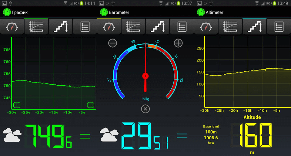 В приложении любую из функций можно настроить предельно точно. Например, для того, чтобы получать более достоверные метеосводки, следует указать базовые величины измерений для своего местоположения, а для высотомера (альтиметра) — высоту над уровнем моря. На графике изменения давления можно задать желаемый период отображения (от 6 до 48 часов).