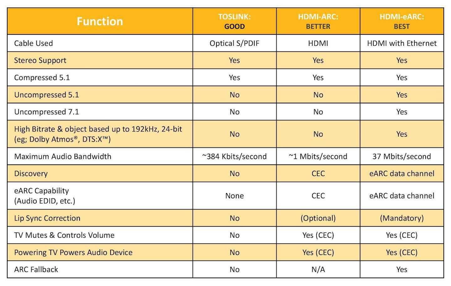Таблица сравнения интерфейсов Toslink, HDMI ARC и HDMI eARC показывает преимущества технологии eARC: звуковая полоса до 37 Мбит/с, канал передачи EDID-информации для корректного взаимодействия устройств, обязательная синхронизация изображения и звука