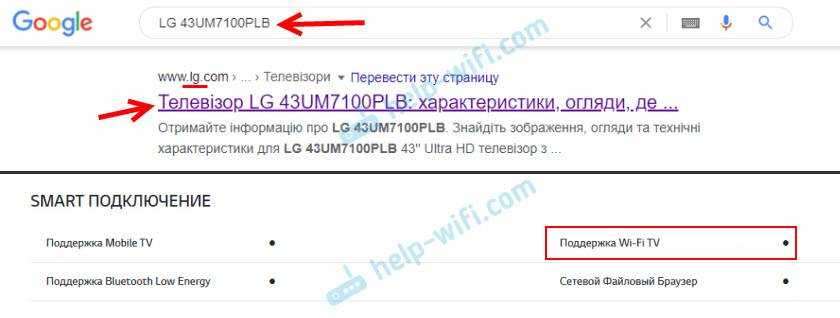 Возьмем модель LG 43UM7100PLB. Находим эту модель на официальном сайте LG и смотрим технические характеристики (спецификации). Если напротив “Поддержка Wi-Fi” стоит точка – значит есть поддержка.