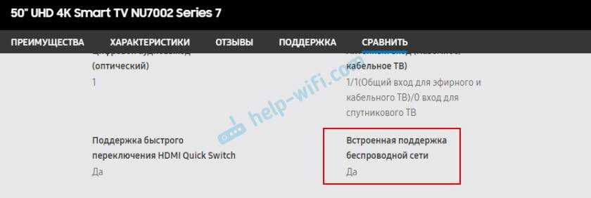 Точно так же все можно проверить на сайте Samsung. Берем модель, например, UE50NU7002UXUA и находим страничку с ее характеристиками на сайте Samsung. “Встроенная поддержка беспроводной сети” – “Да”!
