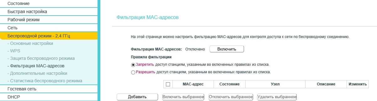 Отключить фильтрацию MAC-адресов. Возможность ограничивать доступ к интернету по уникальному MAC идентификатору есть во всех моделях. Нужно войти в админ-панель и найти вкладку «Фильтрация MAC-адресов». Обычно находится в разделе «Беспроводной режим». Система может быть настроена так, что блокируется подключение с конкретного устройства или со всех девайсов, за исключением тех, которые указаны в списке. Лучше отключить функцию полностью, по крайней мере на время проверки.