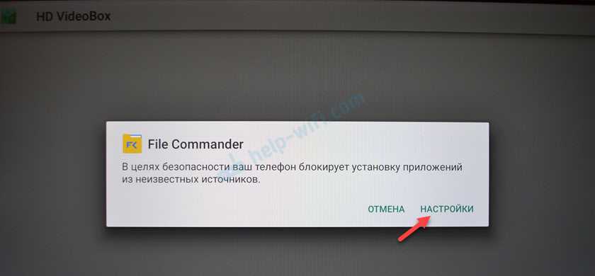 - Вы можете получить сообщение о том, что установка из неизвестных источников запрещена. Если это так, просто нажмите кнопку «Настройки», которая появляется вместе с сообщением, и сдвиньте переключатель рядом с названием приложения, которое вы используете для установки APK (File Commander или Send Files To TV).