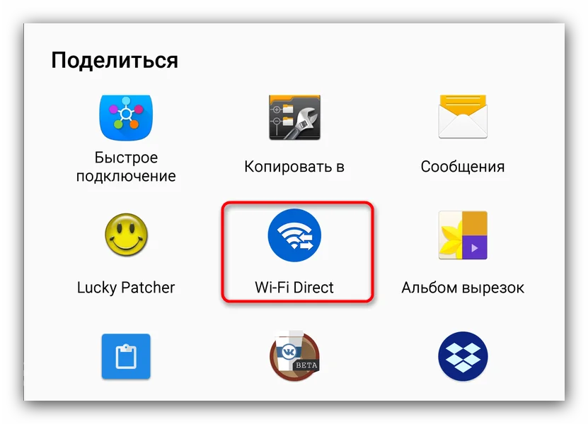 После выполнения этих манипуляций понадобится открыть файловый менеджер или галерею, выбрать необходимый файл, нажать кнопку «Поделиться» и в качестве способа отправки выбрать Wi-Fi Direct.