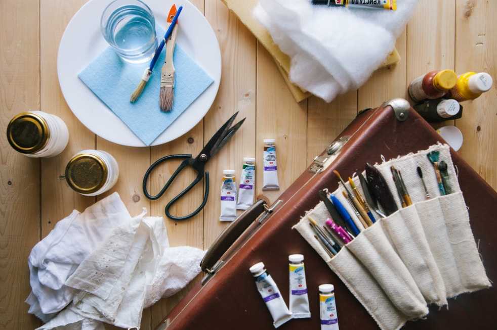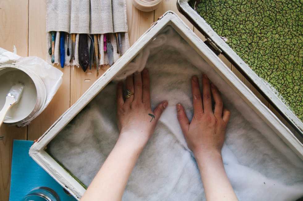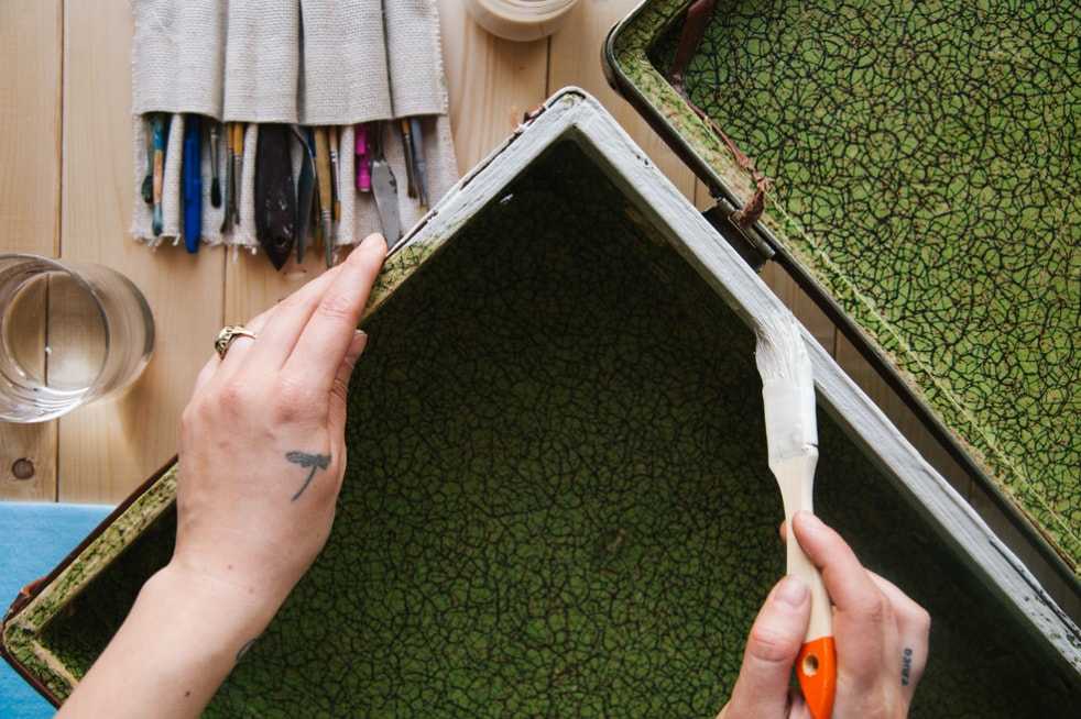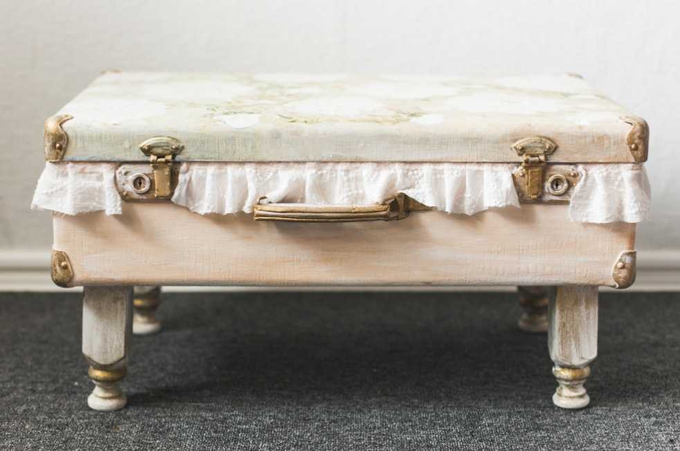 Очищаем чемодан от пыли и грязи, а также снимаем крышку. Протираем всю поверхность влажной салфеткой или тряпкой. Покрываем чемодан акриловым грунтом в два слоя и оставляем до высыхания. При желании можно нарисовать легкие, еле заметные узоры. Если внешний вид чемодана полностью устраиваем, покрываем его лаком и оставляем на несколько часов.
