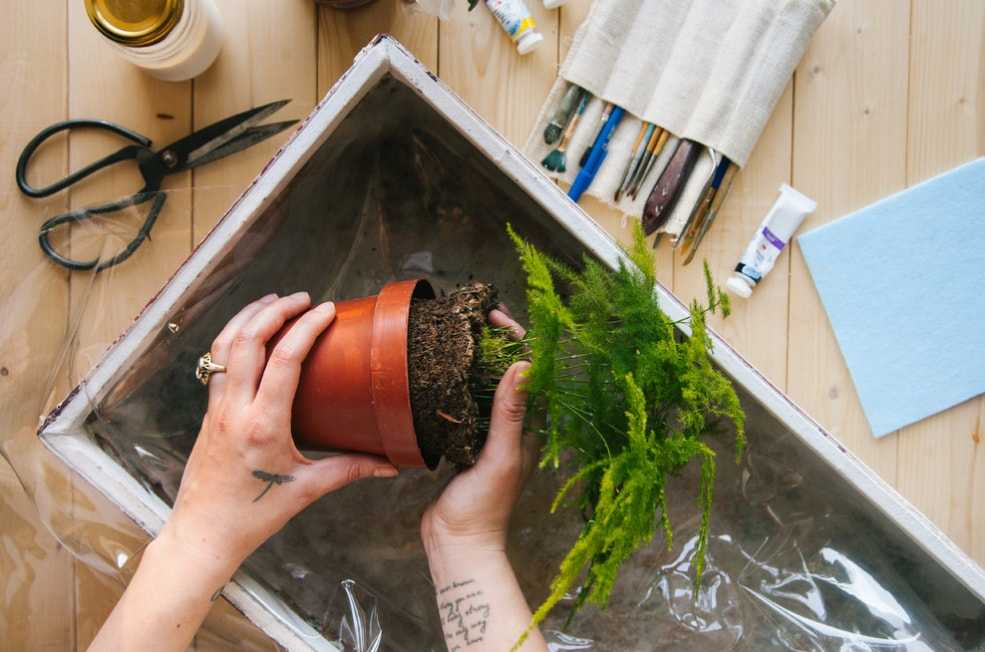 На дно чемодана насыпаем керамзит. Высаживаем цветы и растения из горшков в кашпо и заполняем промежутки между ними землей.