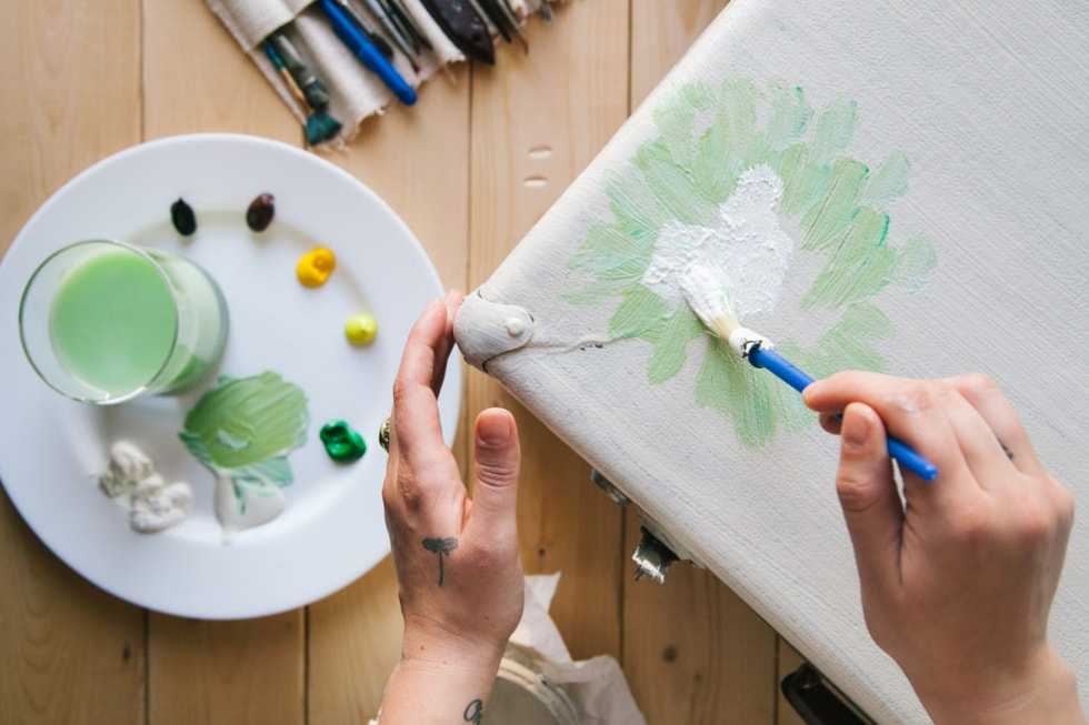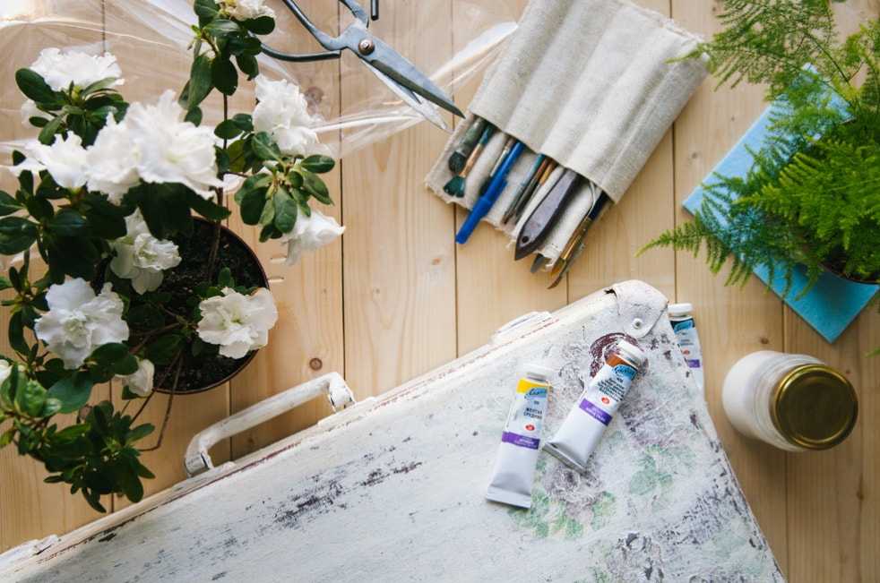 Расписываем поверхность чемодана по своему усмотрению. В данном случае предлагаем нарисовать легкие, воздушные пионы с помощью акриловых красок.