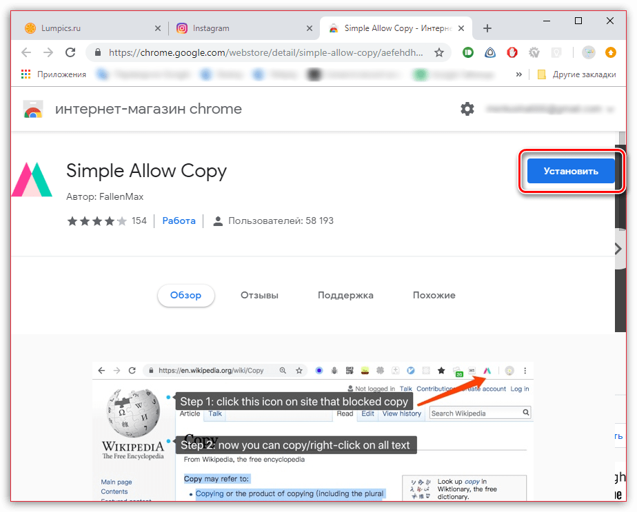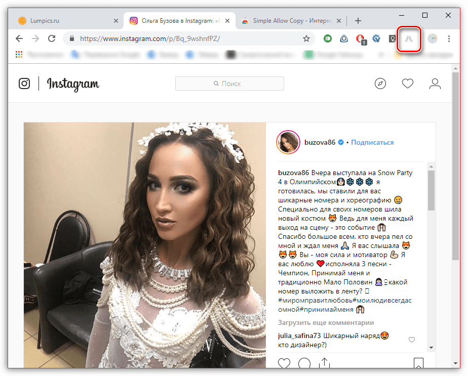 Откройте сайт Инстаграм, а следом и публикацию, в которой требуется скопировать текст. Кликните в правом верхнем углу по иконке Simple Allow Copy (она должна стать цветной).
