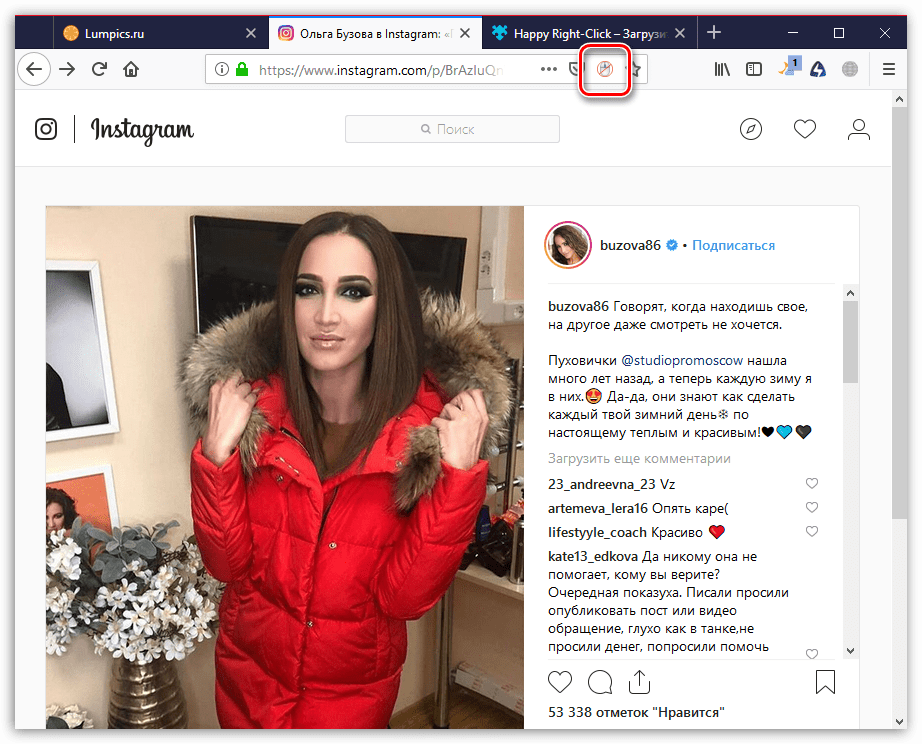 Перейдите на сайт Инстаграм и откройте требуемую публикацию. В адресной строке браузера вы увидите миниатюрную иконку мыши, перечеркнутую красным кружком. Кликните по ней, чтобы активировать работу дополнения на данном сайте.