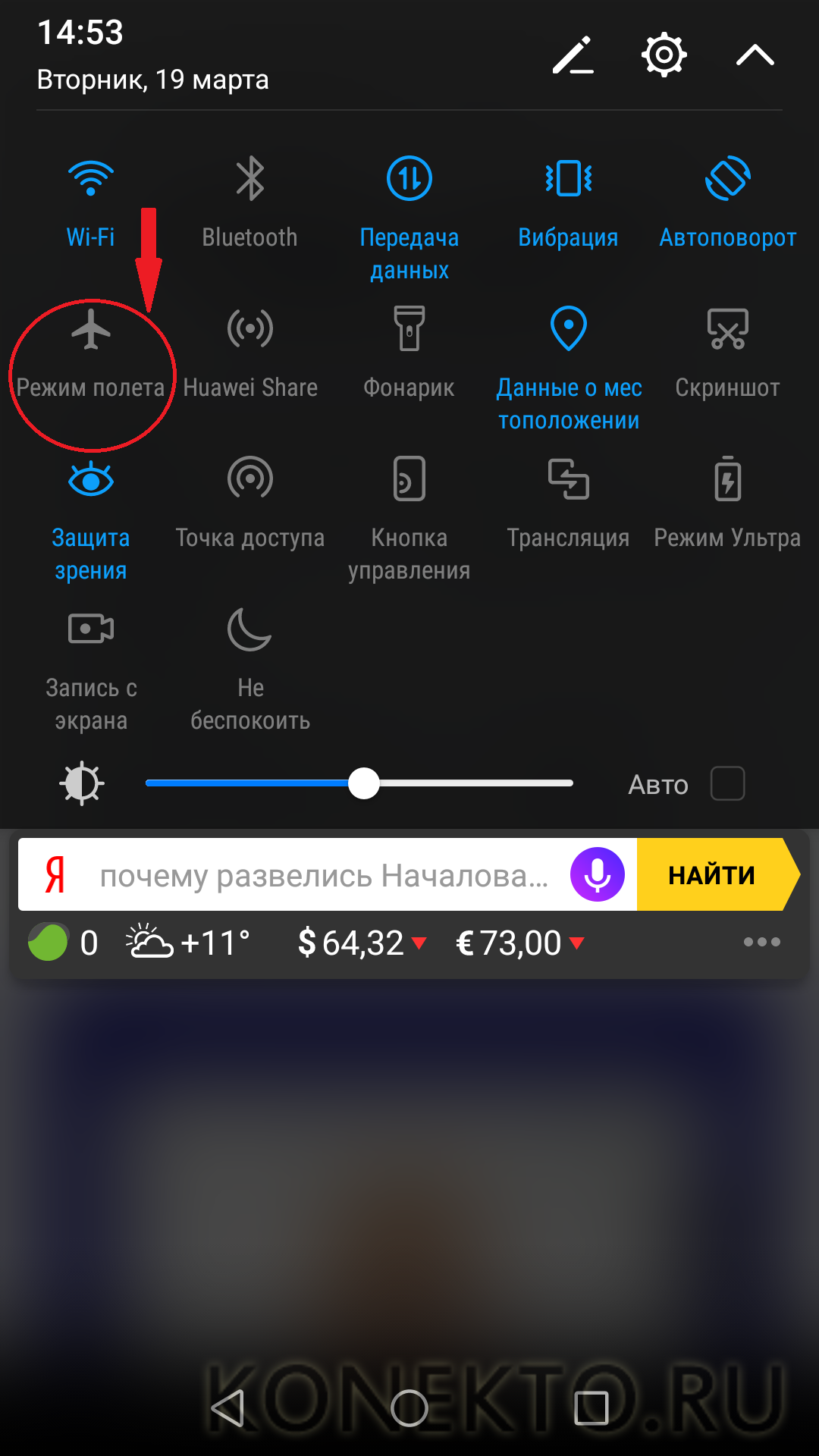 Некоторые неопытные и невнимательные владельцы смартфонов могут самостоятельно помешать стабильной работе телефона. Например, случайно нажать «туда, куда не нужно», даже не заметив изменений. Неприятность проявляется только тогда, когда человек нуждается в совершении определенного действия, а выполнить его не может (в нашем случае – выйти во Всемирную паутину). Одно из самых популярных случайных действий – активация режима полета на смартфоне. Как правило, достаточно всего лишь неаккуратно смахнуть пальцем вниз по экрану и попасть по кнопке «Режим полета». Это несложно, учитывая то, что сенсорные экраны на смартфонах становятся все более отзывчивыми к прикосновениям.