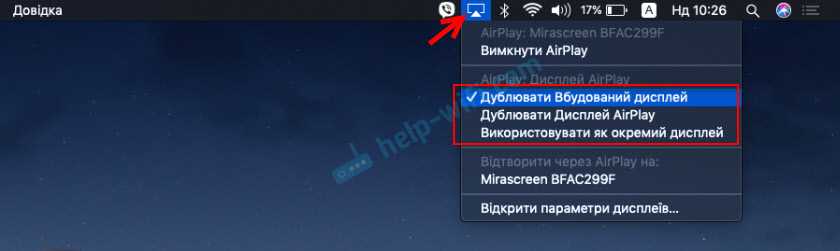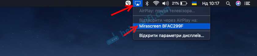 Когда Mac OS увидит, что есть возможность подключения к беспроводному дисплею по AirPlay – в статус баре появится соответствующий значок. Нажав на который, нам нужно только выбрать MiraScreen адаптер.
