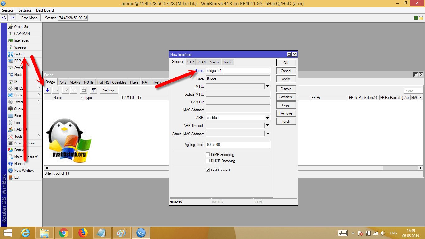 Открываем вкладку «Bridge» и нажимаем + для создания нового моста. В окне «New Interfaces» задаем ему имя в поле «Name» у меня, это будет br-1, нажимаем «Ok».