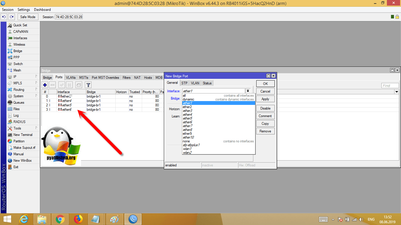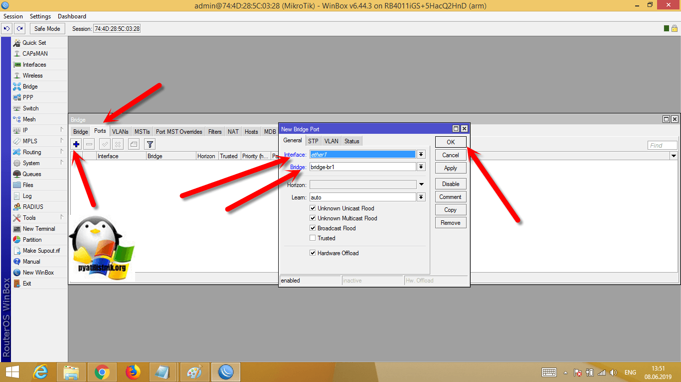 Для добавления в наш сетевой мост на MikroTik RB4011iGS, вы переходите на вкладку «Ports’ и нажимаете +, для добавления порта. Указываете нужный интерфейс, задаете в поле «Bridge» наш созданный сетевой мост и нажимаете «Apply» для применения.