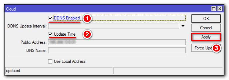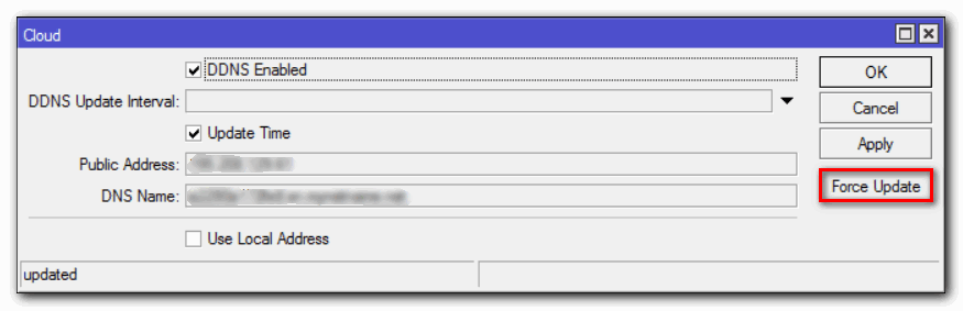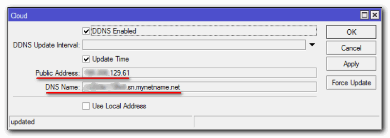 Теперь служба Cloud DDNS проверяет каждые 60 секунд изменение исходящего IP-адреса и сопоставляет его с DNS-именем MikroTik. Благодаря этому мы можем осуществить удаленное подключение к маршрутизатору или получить доступ к внутренним ресурсам сети, используя DNS Name устройства.