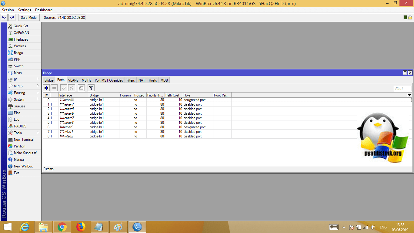 В итоге у меня получилось вот так, не забываем добавлять WLAN порты WIFI. Учтите, что когда вы добавите в мост, порт по которому ваш ноутбук подключен к роутеру микротик, то вы будите отключены в WinBox. Вам потребуется заново установить подключение.