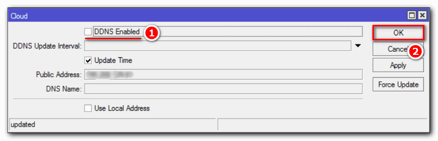 Отключение службы DDNS на MikroTik, производится снятием “галочки”: