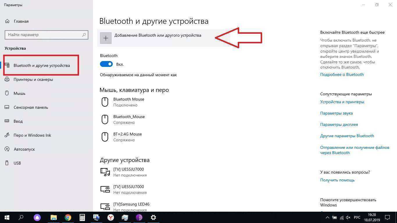 Кроме того, по умолчанию функция Bluetooth на компьютере, где она есть, может быть выключена. Чтобы ее включить на Windows 10, запустите приложение Параметры, откройте раздел “Bluetooth и другие устройства” и передвиньте ползунок “Bluetooth” в положение “включено”.