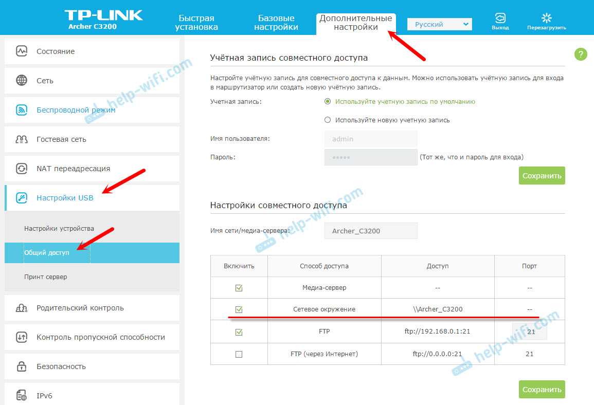 На новых роутерах, с новой панелью управления нужно в разделе «Дополнительные настройки» открыть вкладку «Настройки USB» – «Общий доступ». Мы получали доступ через «Сетевое окружение». Как видите, его можно отключить, просто убрав галочку возле него.