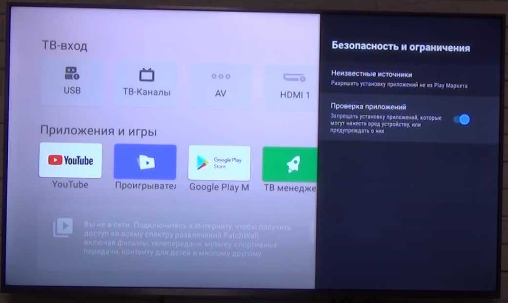 Есть и другой способ, который подразумевает установку приложений из установочных apk-файлов. Чтобы это сделать, вам потребуется скачать файл на смартфон или ПК и передать на телевизор через флешку. Затем включаем «Неизвестные источники» в разделе «Настроек» под названием «Безопасность и ограничения». После это можем запустить файл, найдя его через проводник, и приложение скоро будет установлено.