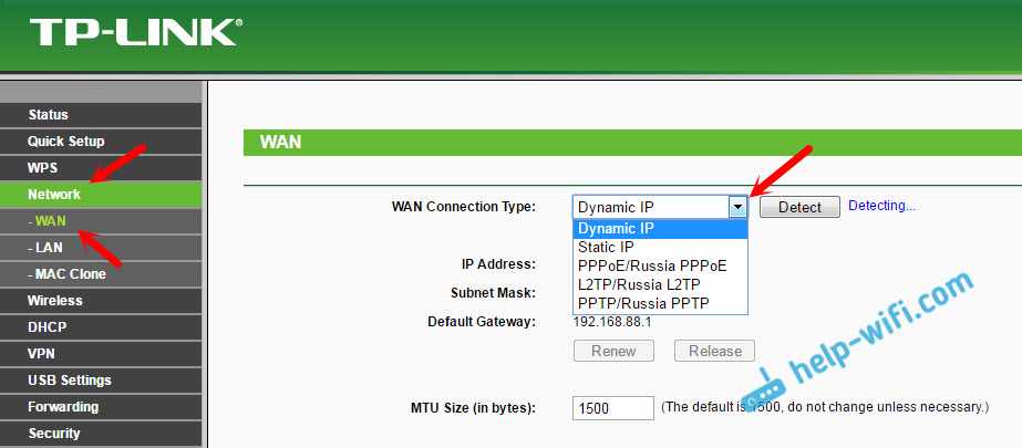 1 Первым делом нужно узнать какой тип подключения использует ваш интернет-провайдер. И если это не Динамический IP, то вы должны знать дополнительные данные (пароль, имя пользователя, адрес сервера). Так же, нужно узнать, использует ли провайдер привязку по MAC-адресу (таких провайдеров не много, но они есть). Вся необходимая информация, как правило указана в договоре по подключению к интернету. 2 Если вы уже пробовали настроить роутер, то лучше сбросить настройки на заводские. Дальше заходим в настройки роутера TP-Link, и на вкладке ‘Network’ (Сеть) – ‘WAN’ выбираем тип подключения, и задаем необходимые параметры.