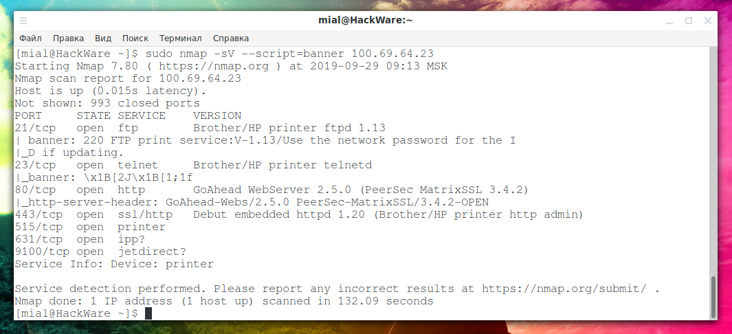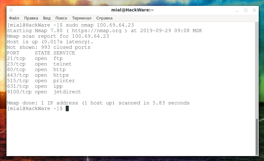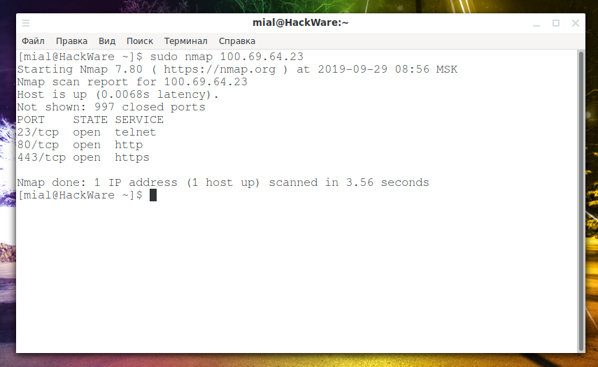 Поясню, хотя команда Nmap одна и та же, но на самом деле в предыдущий раз мы сканировали порты устройства в локальной сети с IP 192.168.1.2. А последняя команда уже сканирует порты на 192.168.1.3.